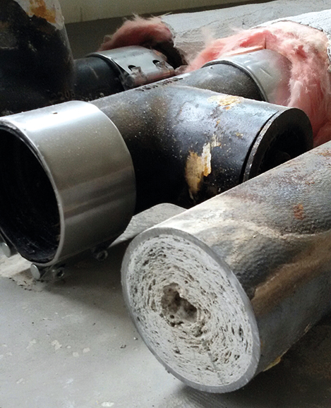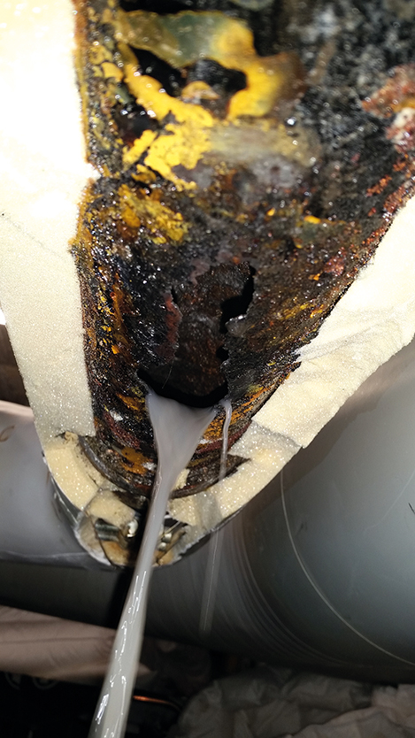 Au sous-sol d'un immeuble commercial, des tuyaux bien isolés sont fixés au plafond. Mais l'un des tuyaux, ou plutôt son isolation, fuit sans discontinuer. Une flaque d'eau considérable s'est formée au sol. TuyauMax doit trouver la source de cette fuite. En découpant l'isolation il s'avère que celle-ci maintenait à peine le tuyau d'évacuation en place. Le tuyau n'a jamais été entretenu et est rongé par les acides gras.