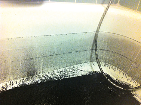 Il arrive que de l'eau sale refoule, dans la baignoire, douche et évier depuis la colonne de chute de l'immeuble. Par exemple, vers les baignoires au rez-de-chaussée d'un immeuble collectif. (Photo : l'eau et les saletés se sont à nouveau écoulées après l'intervention de TuyauMax.)
